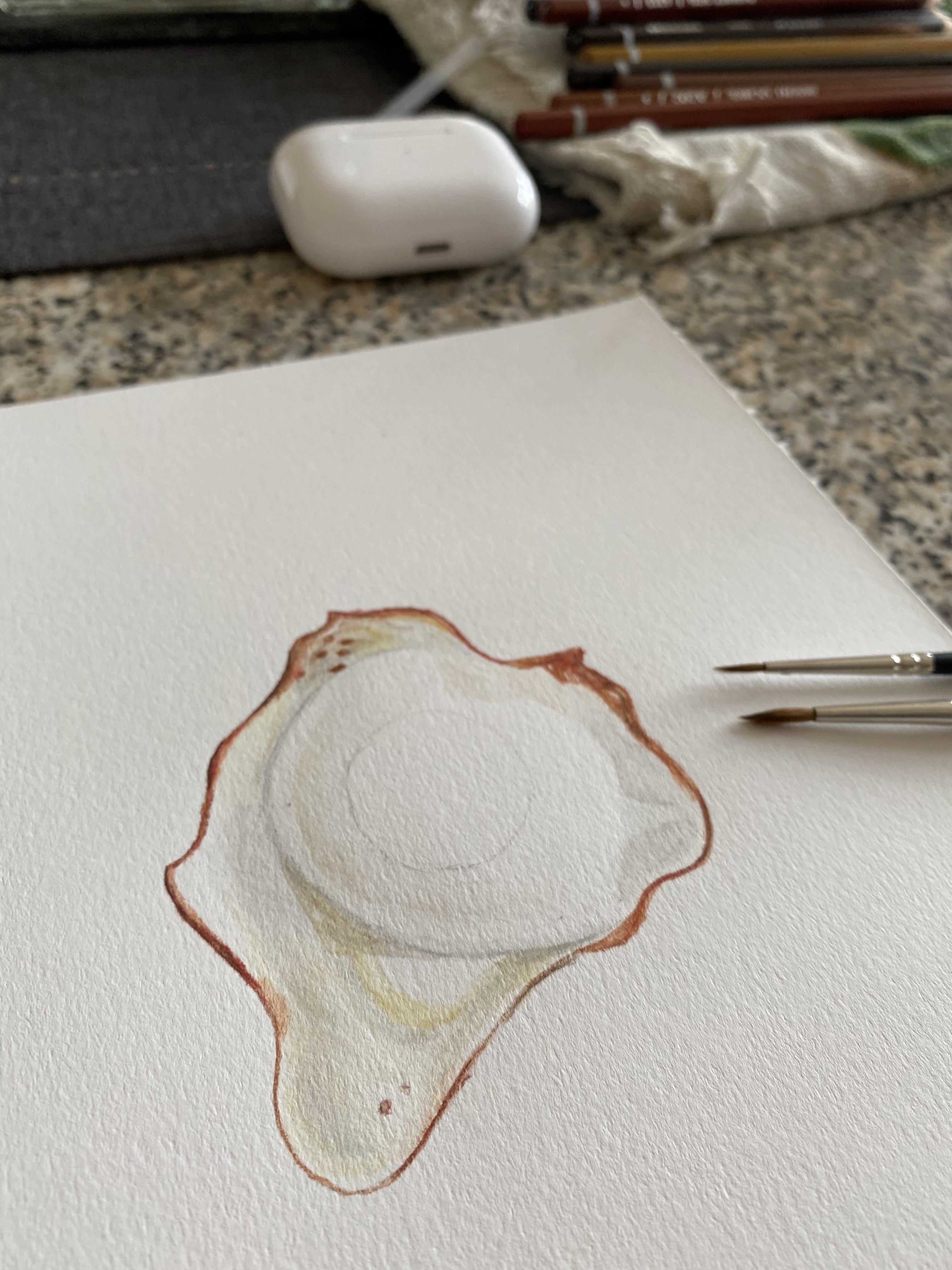 Dopo aver individuato il punto da cui arriva il fascio di luce, con le matite acquerellabili Arteza ho iniziato a colorare la parte di soggetto più lontana rispetto a me, in questo caso l’albume, utilizzando diverse scale di grigi, gialli tenui ed ocra; per la parte più esterna, alla quale ho voluto dare un effetto bruciacchiato, ho utilizzato più marroni: dal cannella per le zone più chiare, fino al cioccolato fondente per i punti più evidenti.