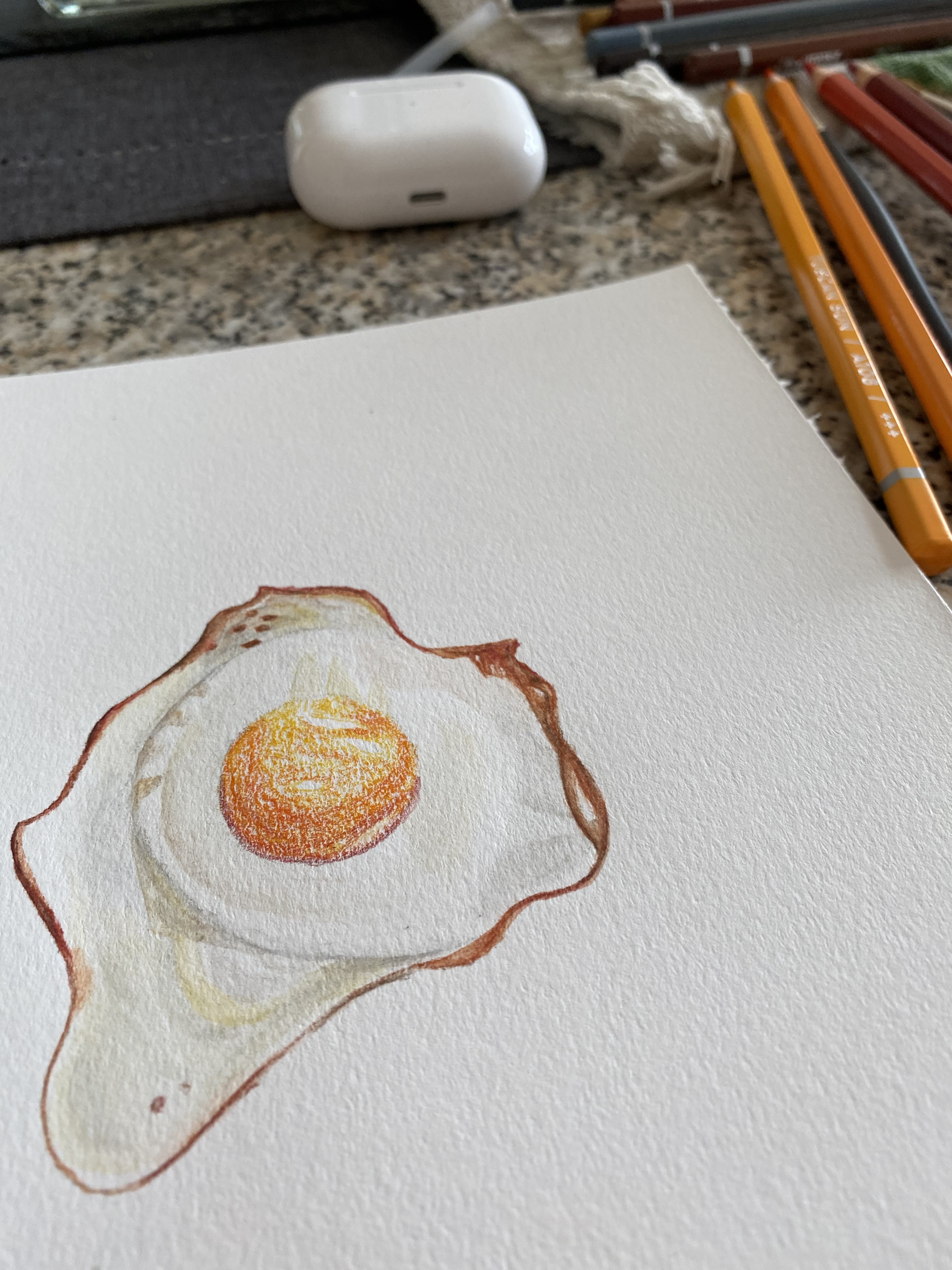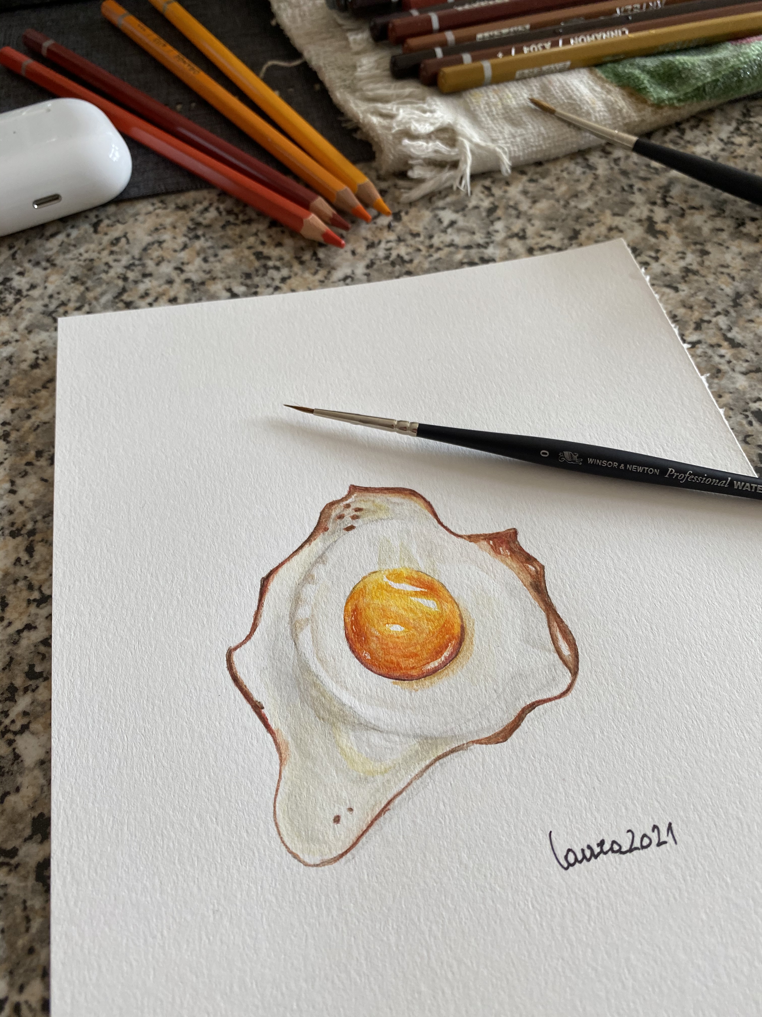 Seguendo quello che è uno dei soggetti più raffigurati in questo genere di arte, ho utilizzato un foglio Fabriano a grana ruvida da 220g/mq di dimensione pari a 12×16,5 cm, sul quale ho disegnato un primo soggetto del mio uovo fritto.