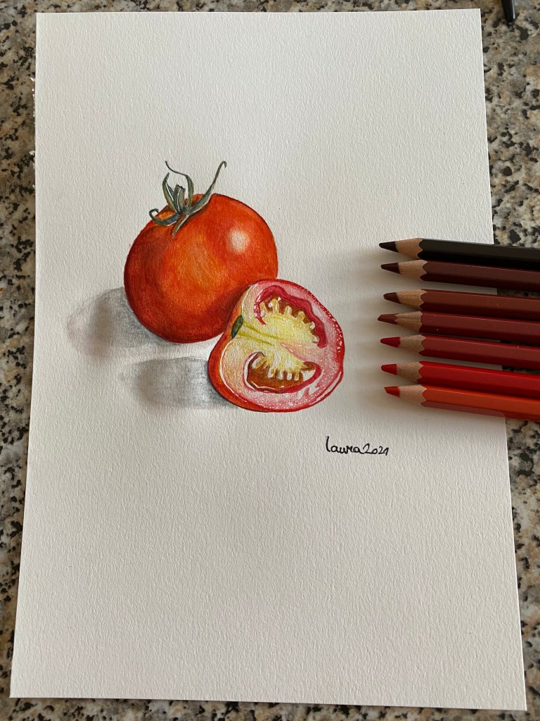 Come per molti dei miei disegni, ho utilizzato un foglio Fabriano delle dimensioni di 12cm x 16,5cm con la superficie ruvida; sul quale ho iniziato l’opera tracciando i bordi del mio pomodoro, un classico dalla forma globosa, studiando le proporzioni tramite fotografie.