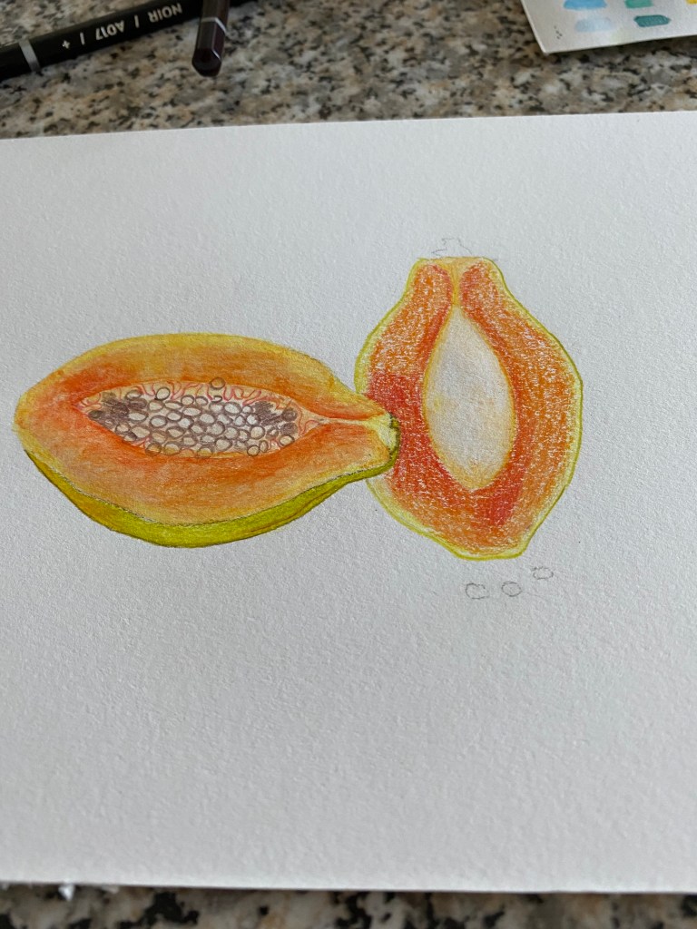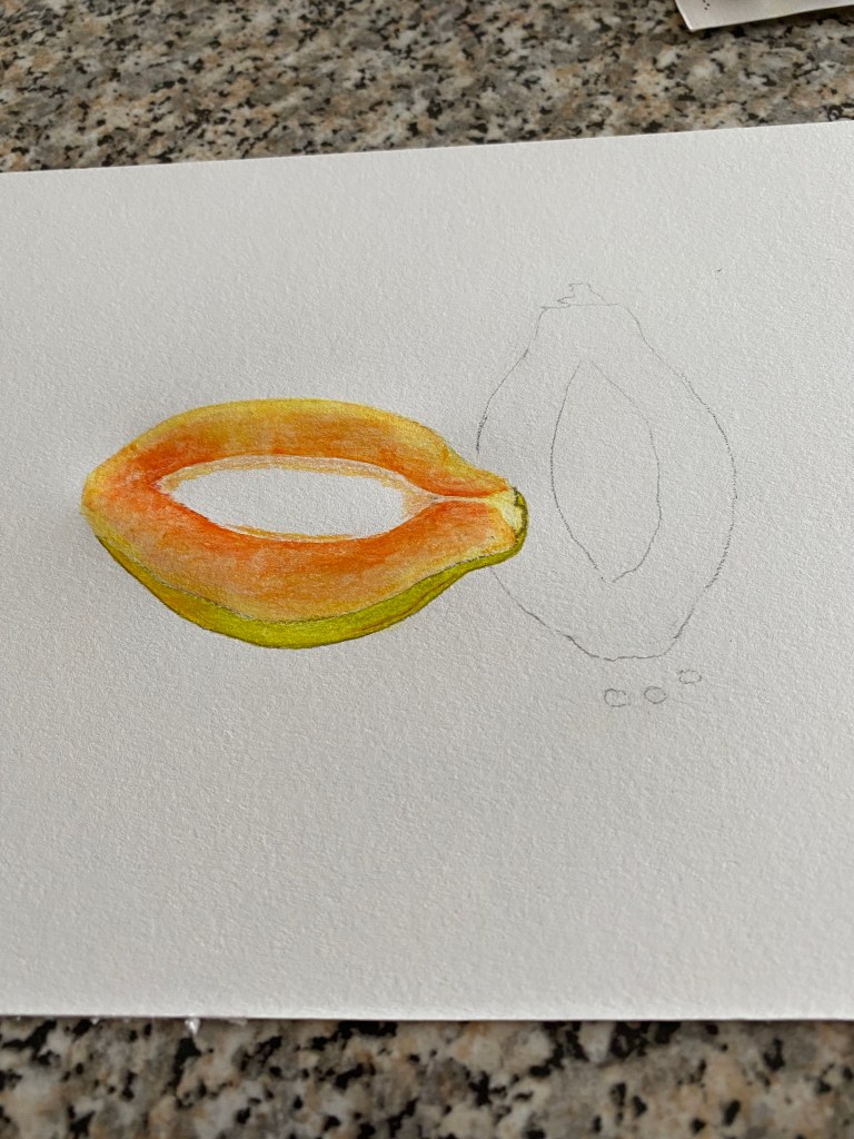 Ho iniziato a tracciare le linee che definiscono l’opera su un foglio F4 (12 cm x 16,5 cm), utilizzando una mina dura dal tratto fine e chiaro. Sono andata avanti nella creazione del disegno, definendo i primi colori: sono partita dalla polpa, caratterizzata da varie tonalità di gialli ed arancioni, arrivando fino alla buccia esterna, con dei gialli freddi e verdi tenui.