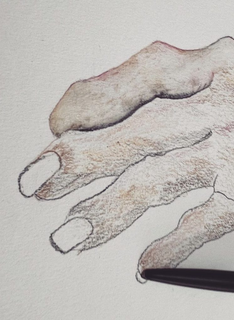 Successivamente, con diverse matite dalle sfumature marroni, dal più tenue cannella al più deciso color espresso, ho iniziato a tracciare i solchi delle rughe presenti sulle dita, sulle nocche e sul dorso della mano.